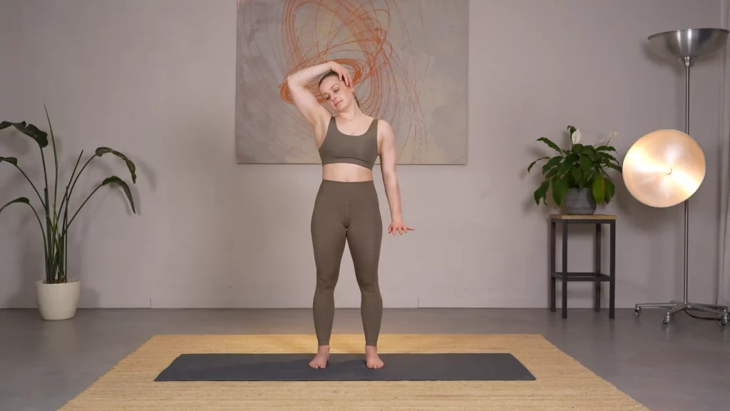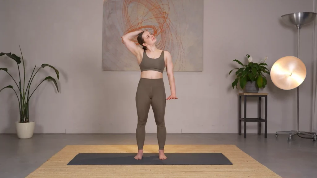 Vertiefte Dehnung für Schulter und Nacken – lindert Spannung und fördert Aufrichtung.